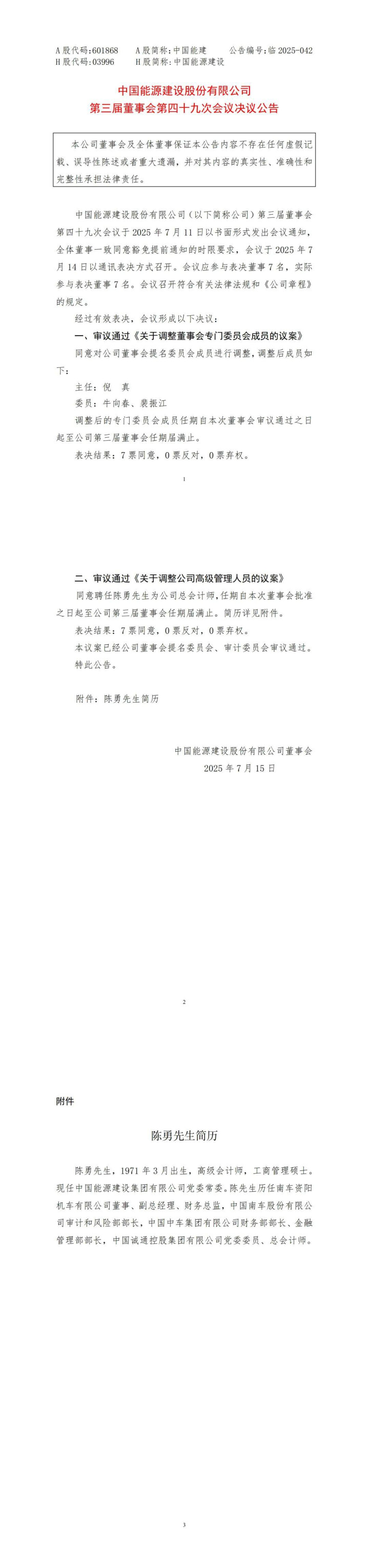 陈勇先生,1971年3月出生,高级会计师,工商管理硕士。现任中国能源建设集团有限公司党委常委。陈先生历任南车资阳机车有限公司董事、副总经理、财务总监,中国南车股份有限公司审计和风险部部长,中国中车集团有限公司财务部部长、金融管理部部长,中国诚通控股集团有限公司党委委员、总会计师。